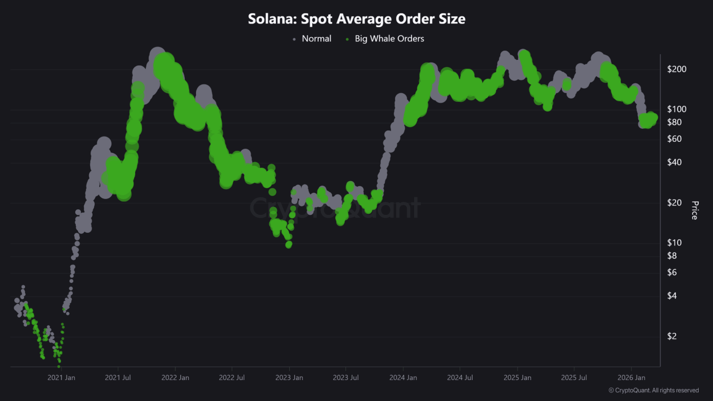 Thông báo này đã nhanh chóng tạo ra phản ứng rõ rệt trên thị trường. Dữ liệu Spot Average Order Size cho thấy quy mô các lệnh mua đang tăng lên, phản ánh hoạt động tích lũy mạnh hơn từ phía các “cá voi” trong vùng giá hiện tại.