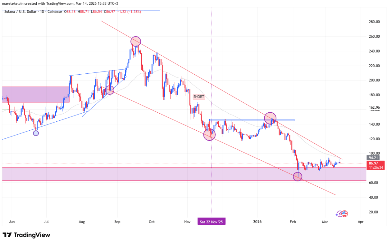 Từ góc độ kỹ thuật, diễn biến này cũng được phản ánh rõ trên biểu đồ hàng ngày. Hiện tại, SOL đang tiến sát một vùng kháng cự quan trọng – nơi hội tụ của hai tín hiệu kỹ thuật đáng chú ý: đường trung bình động hàm mũ (EMA) 50 ngày và cạnh trên của mô hình cái nêm.