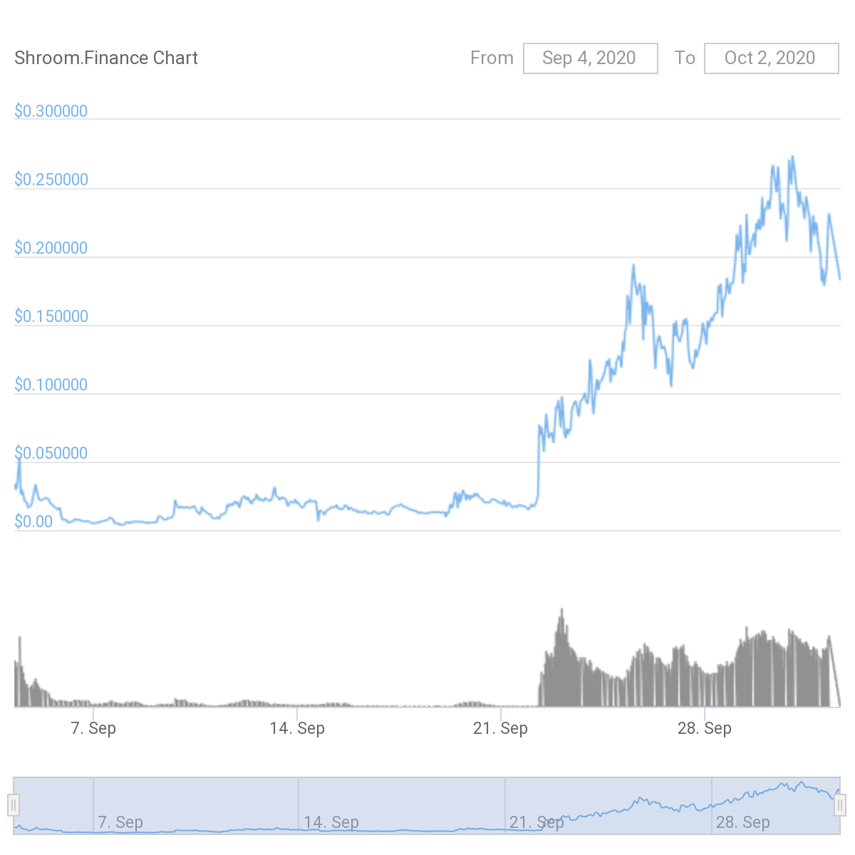Cùng với nhiều token DeFi, Shroom là một tài sản cực kỳ biến động trong lịch sử ngắn ngủi của nó. Đồng tiền này ra mắt vào ngày 3 tháng 9 và tăng từ mức thấp 0,003 đô la lên mức cao nhất mọi thời đại là 0,281 đô la vào ngày 30 tháng 9, tương ứng với mức tăng 9,266%, theo CoinGecko. Nhưng trong 24 giờ qua, Shroom đã chứng kiến sự sụt giảm lớn và hiện là $ 0,193 tại thời viết bài.
