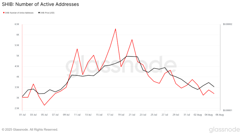 Số lượng ví mới tương tác với Shiba Inu đã giảm đáng kể – từ 2.059 xuống còn 1.171 chỉ trong hai tuần, tương đương mức giảm 44%, cho thấy tâm lý thị trường đối với SHIB đang yếu đi rõ rệt.