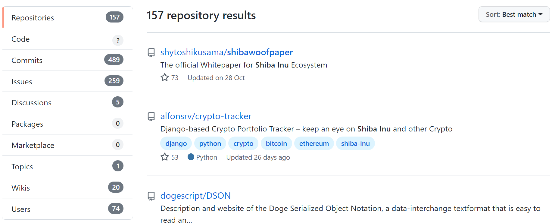 Vào thời điểm báo chí, Shiba Inu có ít kho lưu trữ hoạt động trên Github hơn bất kỳ dự án lớn nào khác với 157. Trong khi đó, DOGE có hơn 1400 và Bitcoin có 52000. Công bằng mà nói thì khía cạnh phát triển của nó vẫn còn khá mờ nhạt.