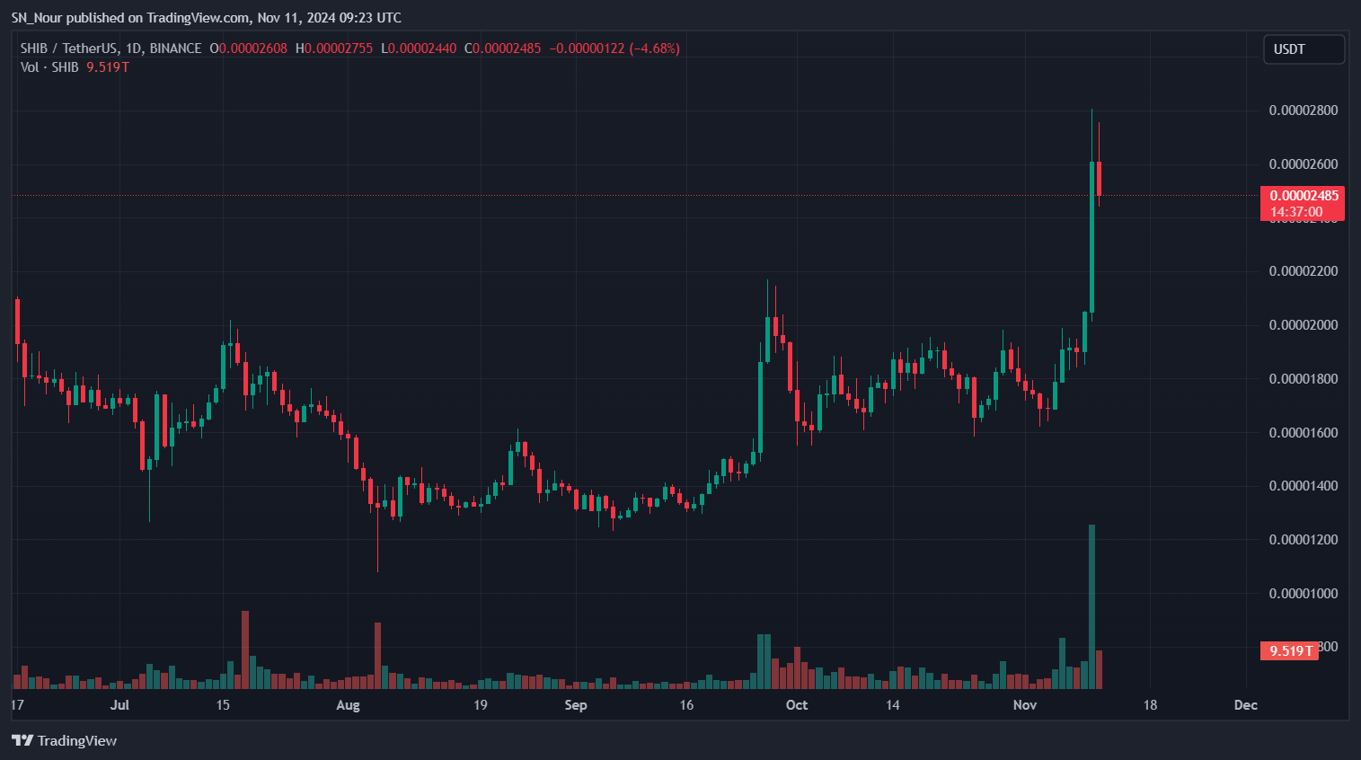 Vào ngày 10 tháng 11, dữ liệu từ các trang web theo dõi giá tiền điện tử, bao gồm CoinGecko và CoinMarketCap, cho thấy SHIB nằm trong top 3 đồng tiền có hiệu suất tốt nhất trên thị trường. Trong ngày đó, giá SHIB tăng 25%, đạt mức $0,000027, đây là mức đỉnh mới trong nhiều tháng và đã đẩy giá trị vốn hóa thị trường của đồng coin này lên hơn 14 tỷ USD.