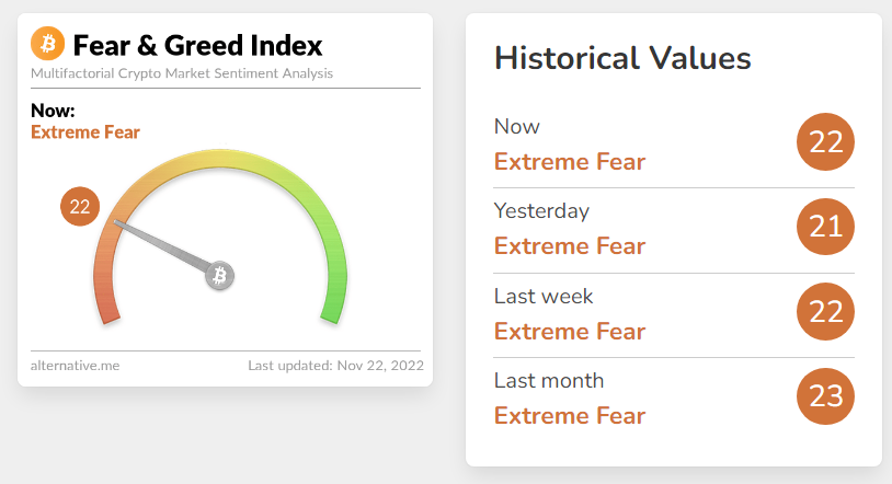 Hành động của thị trường tuân theo tâm lý. Chỉ số Crypto Fear & Greed cho thấy ngay bây giờ, các trader đang ở trong trạng thái “sợ hãi tột độ”, chạm 22 điểm trên thang điểm từ 0 đến 100, với 0 là giai đoạn hoảng loạn tuyệt đối về mặt lý thuyết khi không ai sẵn sàng đầu tư trong một tài sản và 100 là giai đoạn lòng tham tuyệt đối khi không ai sẵn sàng bán tài sản của mình.