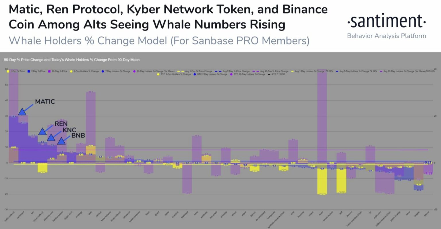 Santiment chỉ ra rằng các đồng tiền như Binance Coin, Ren Protocol, Matic, v.v. hiện đang chứng kiến các ví lớn mới được hình thành và hoạt động lớn hơn trong nhóm nhân khẩu học này.