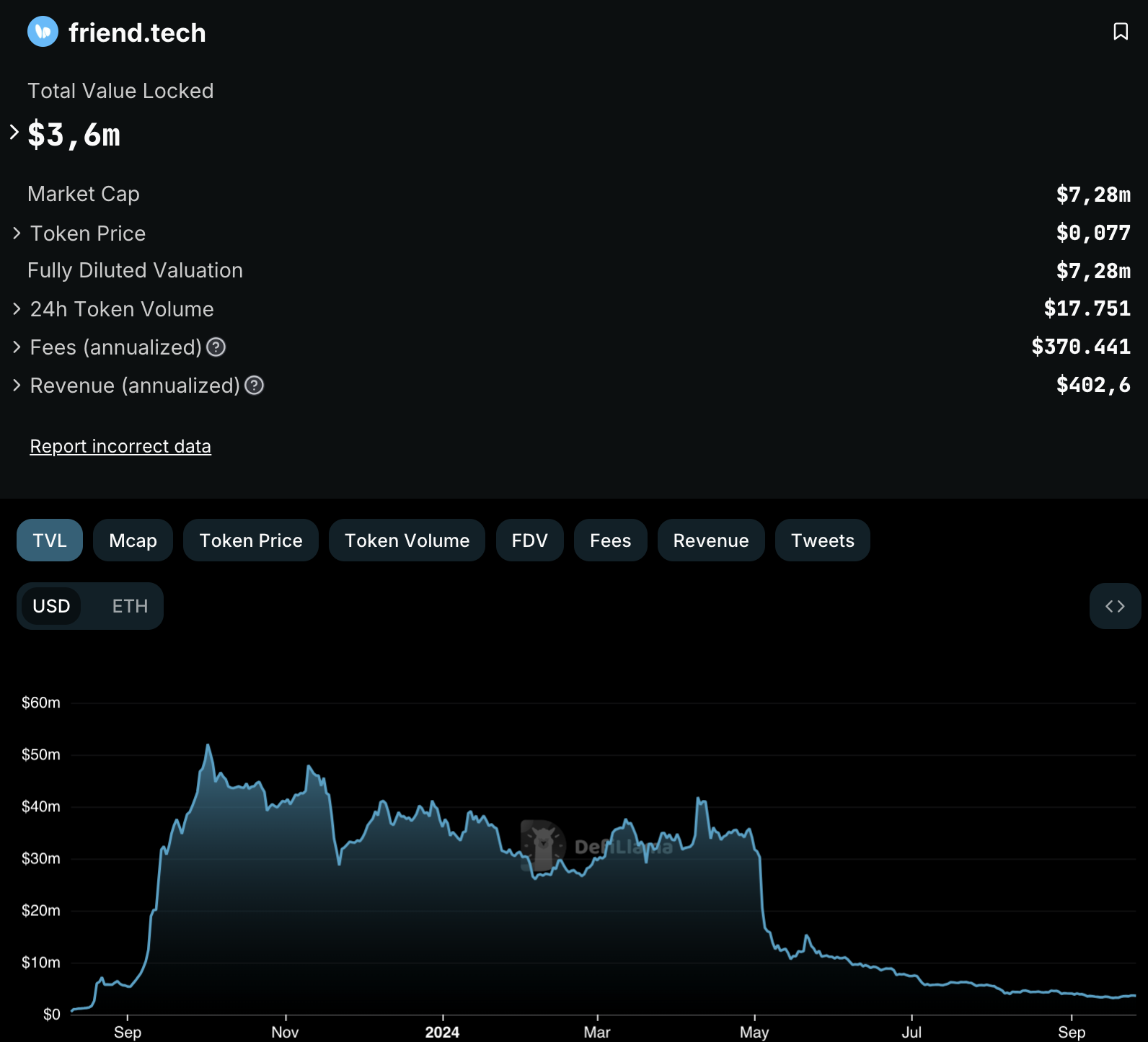 Tổng giá trị bị khóa (TVL) trên giao thức dường như ủng hộ cho câu chuyện này. TVL trên Friend.tech đạt đỉnh vào tháng 10 năm 2023 ở mức 52 triệu đô la, chỉ ba tháng sau khi ra mắt. Vào ngày 1 tháng 1, TVL là 36 triệu đô la. Mới tháng 5, TVL vẫn ở mức trên 30 triệu đô la, nhưng hiện nay chỉ còn 3,6 triệu đô la.