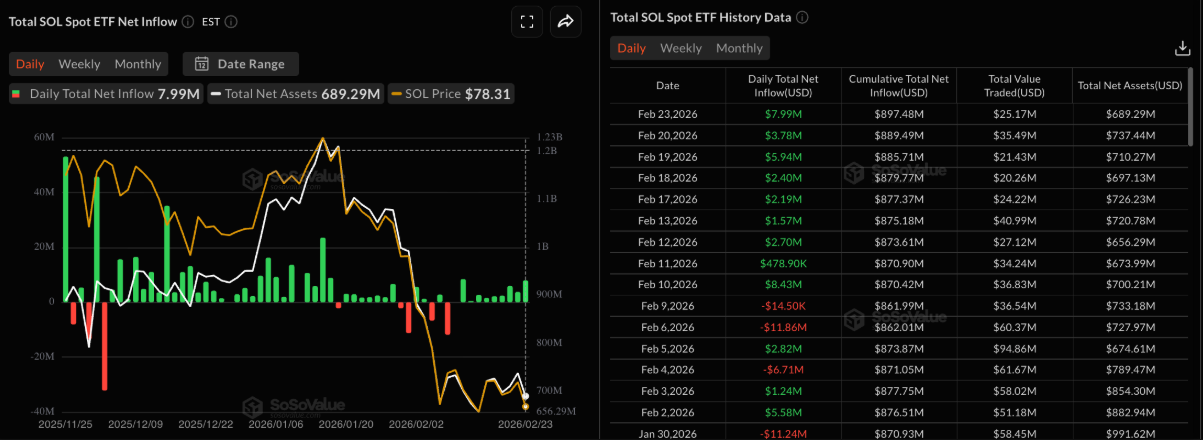 Solana tiếp tục khẳng định vị thế là điểm đến tương đối ổn định trong mắt các nhà đầu tư tổ chức, bất chấp bối cảnh thị trường chung vẫn chịu nhiều sức ép. Các Solana ETF giao ngay tại Mỹ đã ghi nhận dòng vốn ròng 7,99 triệu USD trong phiên thứ Hai, qua đó đánh dấu phiên hút vốn thứ chín liên tiếp – một tín hiệu cho thấy niềm tin dài hạn vẫn được duy trì.