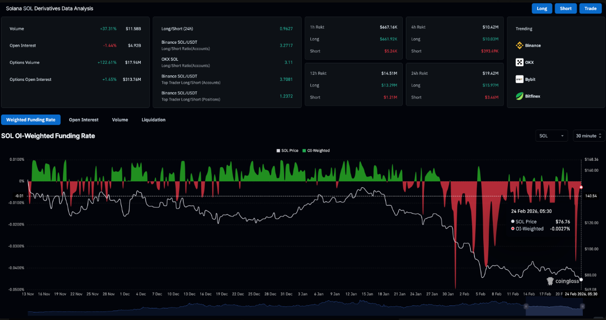 Tuy nhiên, Solana vẫn ghi nhận những điểm tựa đáng chú ý khi dòng tiền tổ chức tiếp tục hiện diện, thể hiện qua việc các quỹ ETF không ngừng mở rộng mức độ tiếp xúc với tài sản này. Trái lại, thị trường phái sinh đang chịu ảnh hưởng rõ rệt từ tâm lý sợ hãi, khiến biến động ngắn hạn trở nên khó lường hơn.