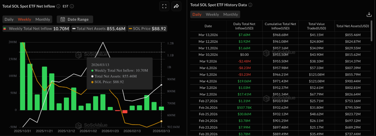 Solana tiếp tục thu hút sự quan tâm mạnh mẽ từ khối tổ chức khi các quỹ ETF tập trung vào SOL ghi nhận dòng vốn vào 7,60 triệu USD trong ngày thứ Sáu, qua đó nâng tổng dòng tiền ròng cả tuần lên 10,70 triệu USD. Dòng vốn ETF duy trì ổn định phản ánh nhu cầu bền bỉ từ các tổ chức, yếu tố có thể góp phần hạn chế áp lực giảm giá trên thị trường.