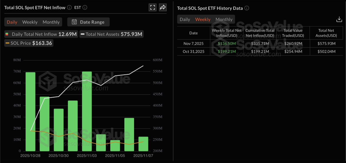 Các quỹ Solana ETF giao ngay tại Mỹ vừa ghi nhận ngày thứ chín liên tiếp dòng vốn ròng đổ vào, với tổng cộng 136,5 triệu USD trong tuần trước, mở ra tín hiệu tích cực hỗ trợ giá SOL. Dòng vốn ETF gia tăng mạnh mẽ này đang trở thành một lực đỡ quan trọng, phản ánh sức hút ngày càng lớn của Solana đối với nhà đầu tư.