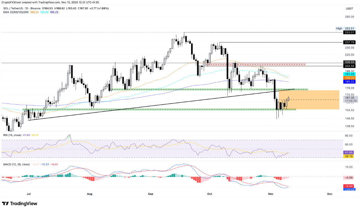 Solana vừa ghi nhận cây nến tăng thứ hai liên tiếp trên biểu đồ hàng ngày, mở rộng đà hồi phục từ vùng hỗ trợ 155 USD vào Chủ nhật. SOL đang hướng tới thử thách đường xu hướng bị phá vỡ trước đó và vùng kháng cự quanh 175 USD, nơi từng là điểm quan sát quan trọng tuần trước.