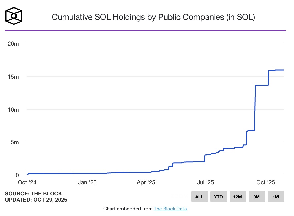 Theo dữ liệu từ bảng tổng hợp của The Block, các công ty niêm yết hiện đang nắm giữ khoảng 16 triệu SOL, tương đương 3,2 tỷ USD, tăng mạnh so với mức gần như bằng 0 vào đầu năm 2025.