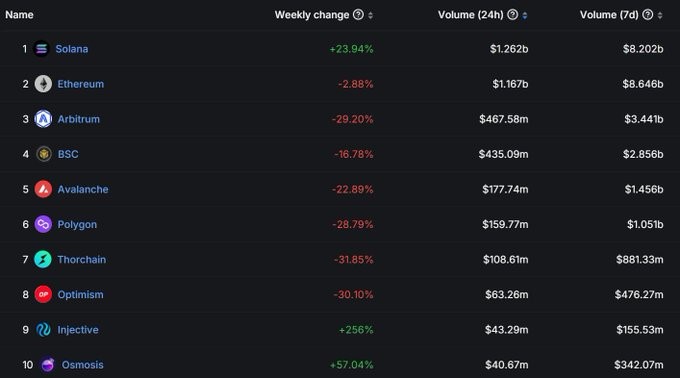Trên thực tế, tốc độ tăng trưởng hàng tuần 31% của Solana nổi bật giữa biển đỏ. Gần như tất cả các chain bên dưới Solana trong danh sách top 10 đều chịu mức lỗ hàng tuần ở mức hai con số.