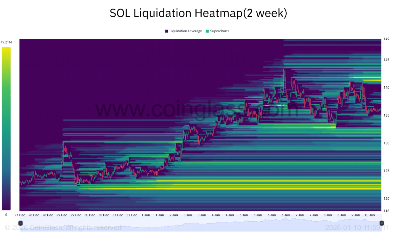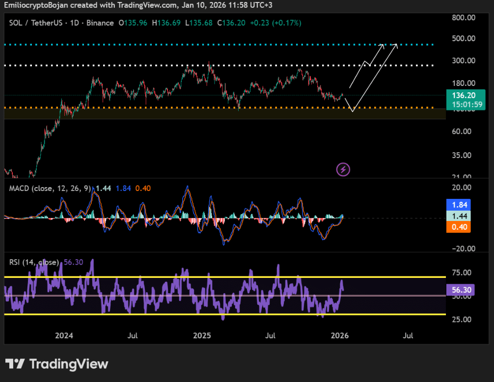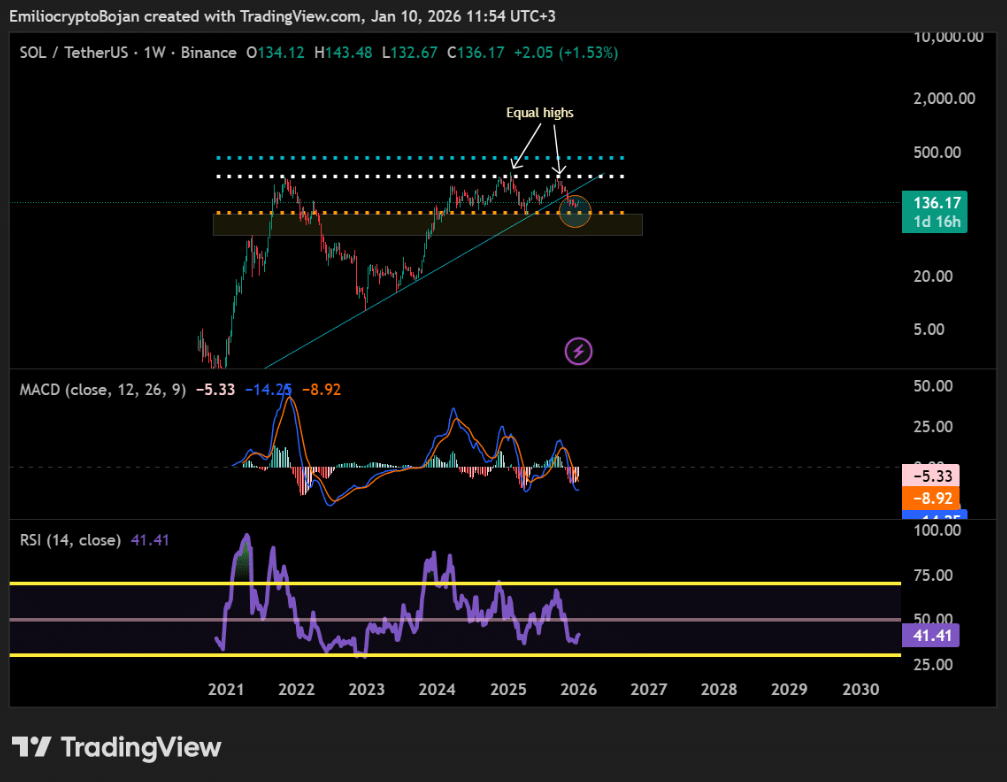 Trên biểu đồ ngày, Solana (SOL) đang dao động quanh mốc 136 USD vào ngày 10/1, song đà phục hồi vẫn khá mong manh khi thị trường chung duy trì tâm lý tiêu cực. Rủi ro điều chỉnh sẽ gia tăng đáng kể nếu SOL hình thành mức đáy tương tự quanh mức 102 USD — tín hiệu cho thấy lực cầu suy yếu và xu hướng giảm có thể chiếm ưu thế.
