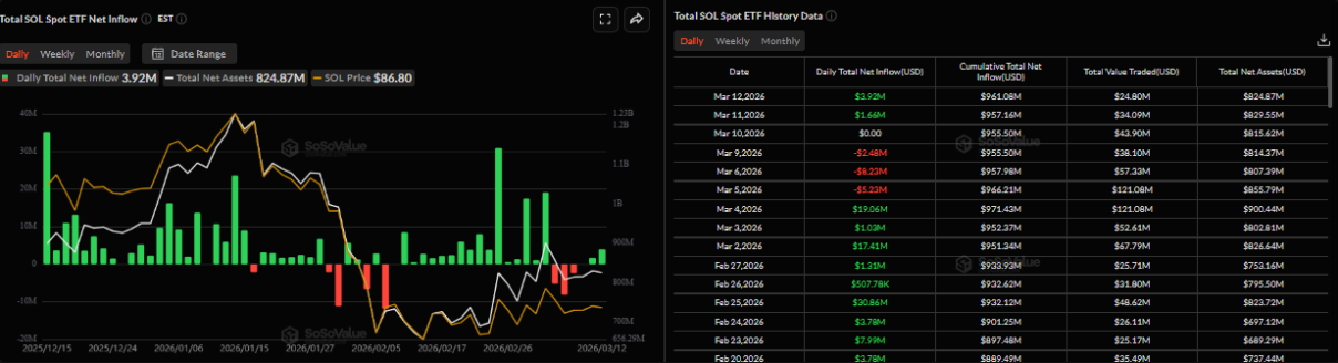 Nhu cầu từ khối tổ chức đối với Solana vẫn duy trì sự ổn định trong tuần này. Theo dữ liệu từ SoSoValue, các quỹ ETF giao ngay của SOL đã ghi nhận dòng vốn ròng 3,92 triệu USD trong ngày thứ Năm, sau khi thu hút thêm 1,66 triệu USD trong phiên trước đó.