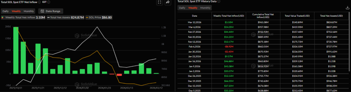 Biểu đồ dòng vốn ròng đổ vào SOL ETF giao ngay hàng tuần | Nguồn: SoSoValue