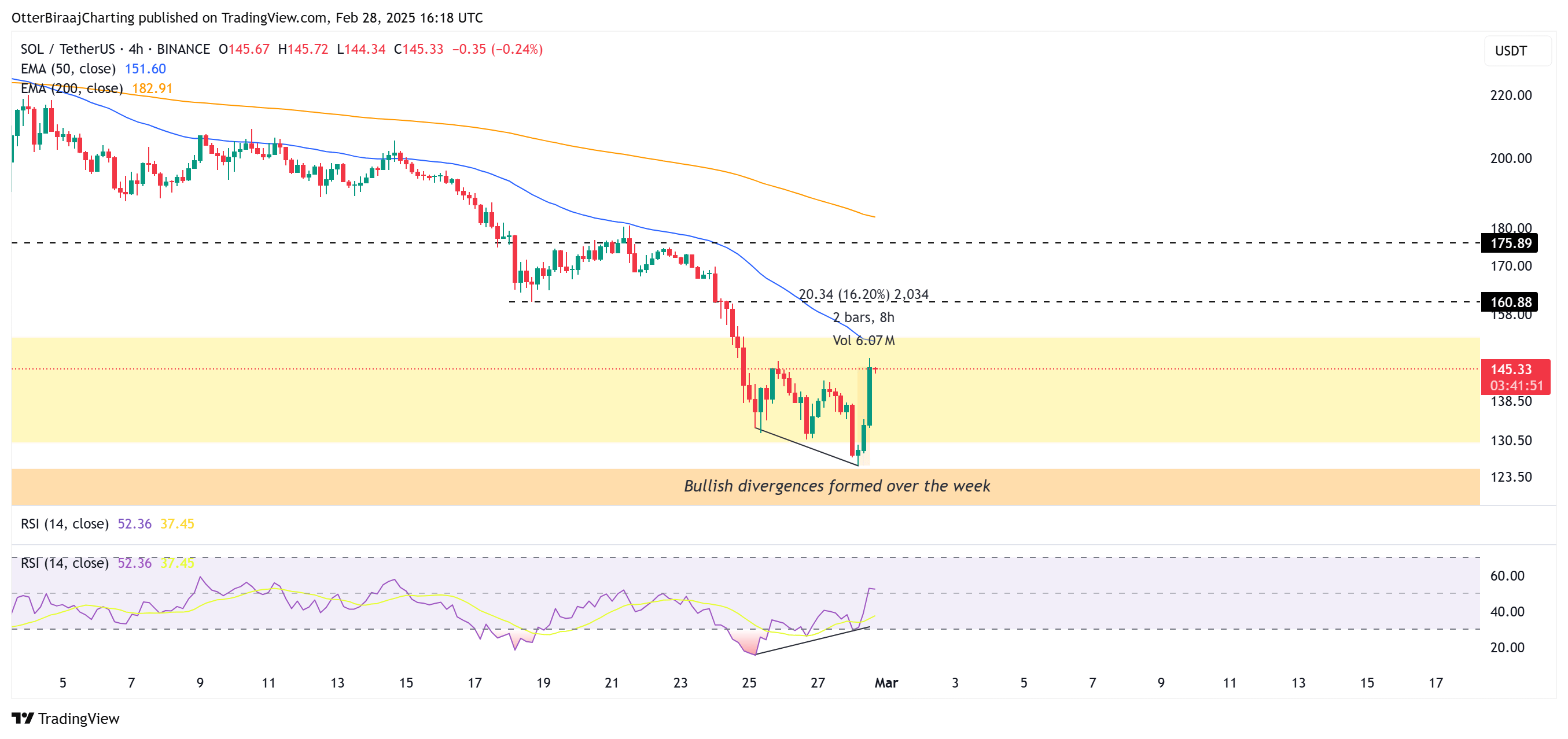 Trong tuần cuối tháng 2, Solana liên tục tạo đáy thấp hơn, đạt mức thấp nhất năm tại 125 USD vào ngày 28/2. Tuy nhiên, dữ liệu kỹ thuật đã ghi nhận tín hiệu phân kỳ tăng rõ rệt giữa chỉ số sức mạnh tương đối (RSI) và giá SOL, báo hiệu khả năng đảo chiều.