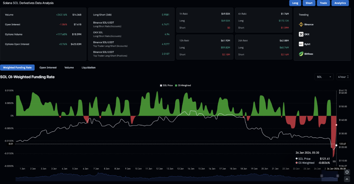 Ở khía cạnh phái sinh, nhu cầu giao dịch cũng hạ nhiệt khi các vị thế Long bị thanh lý hơn 60 triệu USD, vượt xa mức thanh lý short chỉ 2,14 triệu USD trong 24 giờ qua, củng cố xu hướng bán. Hợp đồng mở (OI) của hợp đồng tương lai SOL giảm 1%, xuống còn 7,41 tỷ USD, cho thấy giá trị các hợp đồng đang lưu hành thu hẹp khi các vị thế tăng bị xóa sổ, trong khi các vị thế mới thiên về giảm, được minh chứng qua tỷ lệ funding rate -0,0036%.