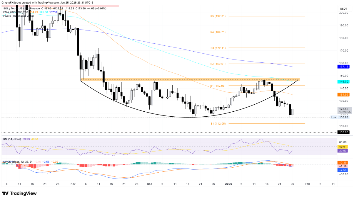 Về mặt kỹ thuật, Solana đang hướng về mức đáy tháng 12 ở 117 USD, trong khi ngưỡng hỗ trợ tâm lý 100 USD trở nên quan trọng hơn bao giờ hết nếu áp lực bán tiếp tục gia tăng.