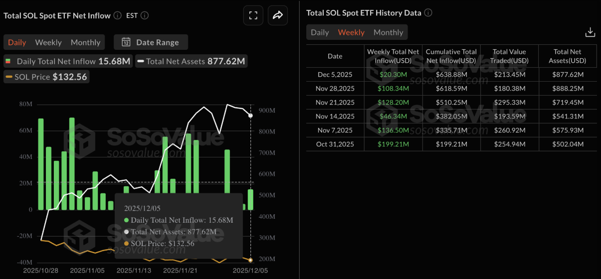 Ở chiều ngược lại, dòng tiền tổ chức vào Solana có dấu hiệu chậm lại, với 20,30 triệu USD rót vào các ETF SOL trong tuần — thấp hơn nhiều so với mức 108,34 triệu USD của tuần trước. Dù vậy, riêng ngày thứ Sáu ghi nhận dòng vốn 15,68 triệu USD, góp phần kéo dài chuỗi 6 tuần liên tiếp có dòng tiền dương vào các ETF Solana.