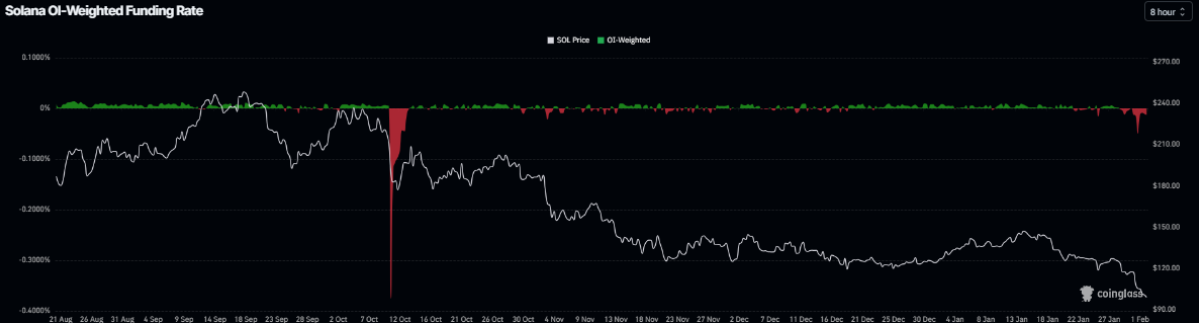 Cụ thể, chỉ số này đã đảo chiều sang vùng âm kể từ thứ Bảy và duy trì ở mức -0,0080% vào thứ Hai. Điều này đồng nghĩa phe gấu đang phải trả phí cho phe bò, qua đó phản ánh tâm lý bi quan ngày càng gia tăng đối với SOL.