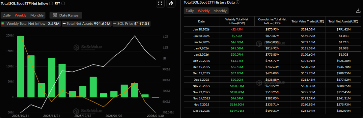 Nhu cầu từ khối tổ chức đối với Solana đã có dấu hiệu hạ nhiệt trong tuần qua. Theo dữ liệu từ SoSoValue, các quỹ ETF giao ngay ghi nhận dòng vốn rút ròng 2,45 triệu USD, qua đó chấm dứt chuỗi tuần hút vốn kể từ thời điểm ra mắt. Diễn biến này phản ánh sự thận trọng gia tăng của nhà đầu tư tổ chức, và nếu đà rút vốn tiếp tục mở rộng trong thời gian tới, SOL có thể phải đối mặt với áp lực điều chỉnh sâu hơn.
