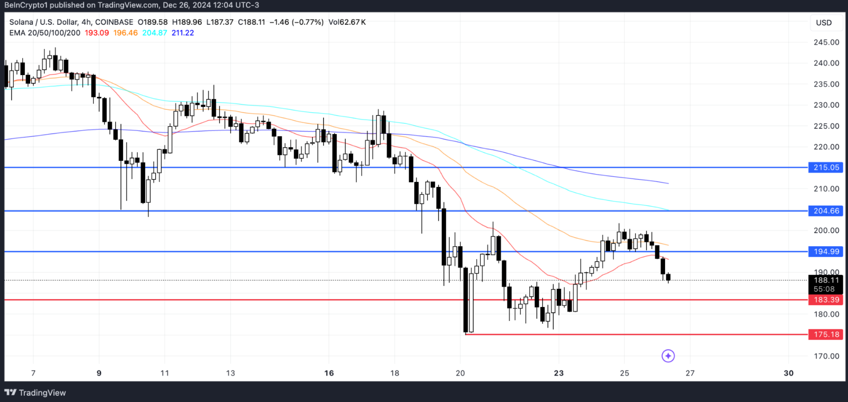 Giá Solana hiện đang giao dịch trong phạm vi được xác định bởi mức hỗ trợ $183 và mức kháng cự $194,99. Nếu mức hỗ trợ $183 không giữ được, giá SOL có thể chịu áp lực giảm thêm, có khả năng rơi về ngưỡng quan trọng tiếp theo ở mức $175.