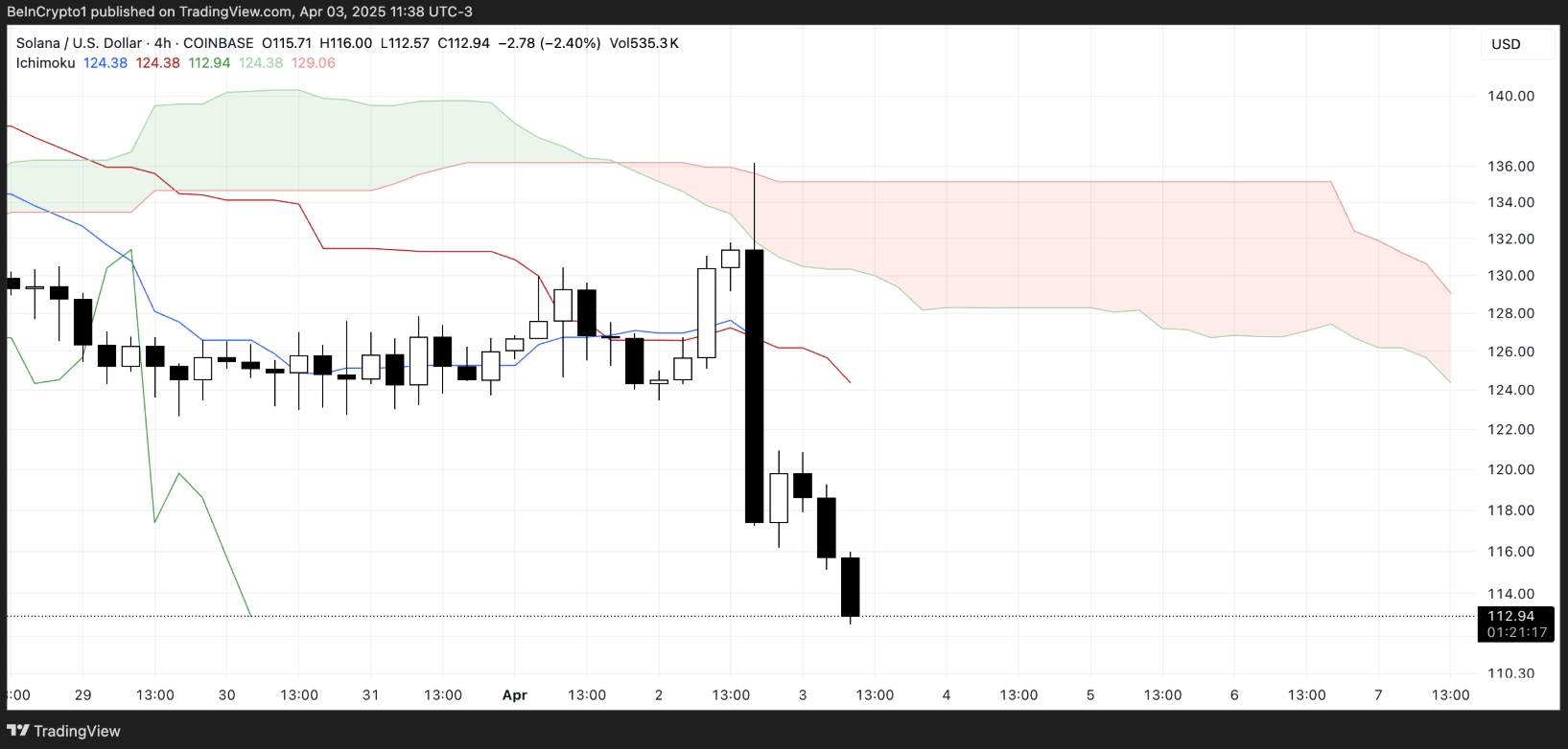 Biểu đồ Ichimoku Cloud của Solana đang phát ra tín hiệu giảm giá mạnh. Giá đã giảm mạnh xuống dưới cả đường Tenkan-sen (đường xanh) và Kijun-sen (đường đỏ), xác nhận sự suy yếu rõ ràng trên thị trường.