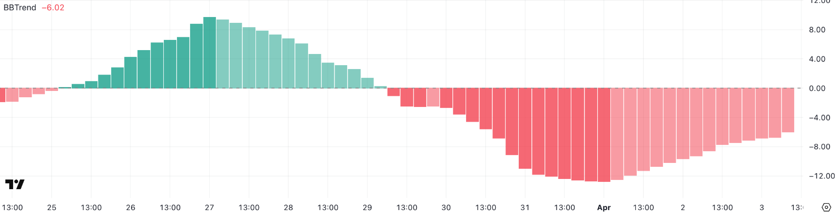 Chỉ báo BBTrend của Solana hiện đang ở mức -6 sau hơn năm ngày liên tiếp nằm trong vùng tiêu cực. Hai ngày trước, chỉ báo này chạm đáy ở -12,72, phản ánh rõ sức mạnh của xu hướng giảm gần đây.