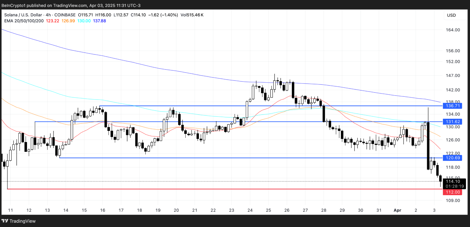 Giá Solana đã phá vỡ mức hỗ trợ quan trọng $120, và ngưỡng hỗ trợ lớn tiếp theo nằm quanh mức $112. Nếu giá giảm xuống dưới mức này, có thể xảy ra đợt sụt giảm sâu hơn, đẩy SOL xuống vùng $100 lần đầu tiên kể từ tháng 2/2024.