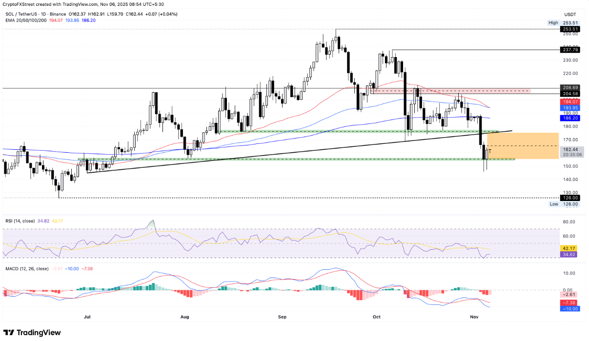 Solana (SOL) đã giảm từ đường trung bình động hàm mũ (EMA) 200 ngày quanh mức 186 USD xuống vùng hỗ trợ 155 USD vào đầu tuần. Đáng chú ý, đợt sụt giảm này còn phá vỡ đường hỗ trợ được hình thành từ các đáy vào ngày 1/7 và 10/10, làm tăng áp lực lên giá.