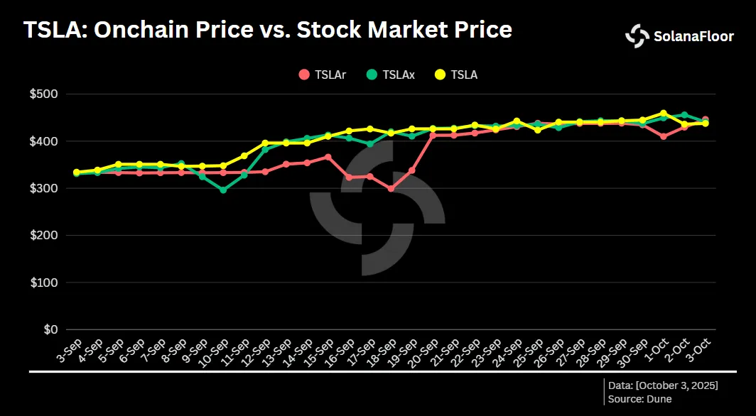 Các token $TSLAr (Remora) và $TSLAx (xStocks) luôn dẫn đầu, với nhiều cơ hội arbitrage xuất hiện do chênh lệch giá giữa token on-chain và giá cổ phiếu ngoài đời thực. Ví dụ: ngày 18/9, $TSLAr giao dịch ở mức trung bình 299 USD, trong khi cổ phiếu Tesla chốt phiên ở 416 USD – tạo ra khoảng chênh lệch hơn 37%. Tương tự, ngày 10/9, $TSLAx được giao dịch ở mức 295 USD so với giá 347 USD của Tesla, chênh lệch 29% trước khi tăng trở lại 382 USD.