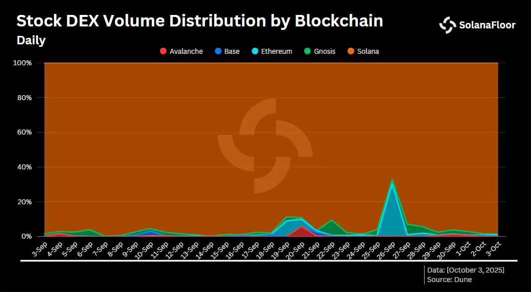 Solana hiện là blockchain dẫn đầu trong mảng giao dịch cổ phiếu token hóa. Trong 30 ngày gần nhất, hơn 95,6% tổng khối lượng giao dịch trên DEX diễn ra trên Solana, trong khi Gnosis đạt 1,98% và Ethereum đứng thứ ba với 1,83%. Ngoại lệ duy nhất là ngày 26/9, khi thị phần Ethereum tăng vọt lên hơn 30% nhưng Solana vẫn giữ 67%. Trong toàn bộ những ngày còn lại, thị phần của Solana duy trì ổn định trên 89%.