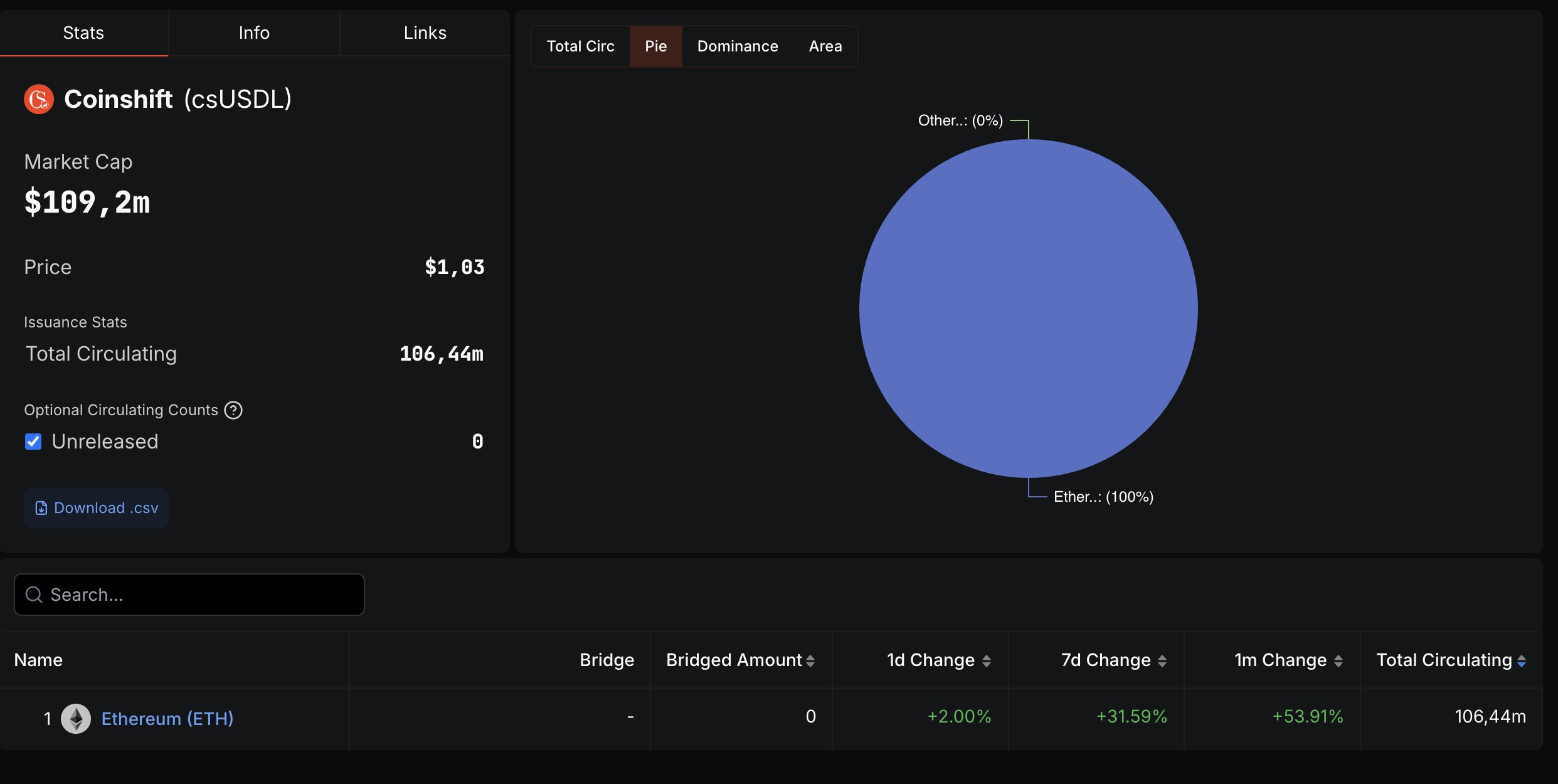 Trong 30 ngày qua, csUSDL đã ghi nhận 16 triệu USD khối lượng giao dịch trên nền tảng Pendle – chuyên về tài sản sinh lợi. csUSDL được xây dựng trên Ethereum, dựa trên USDL do Paxos International phát hành, được quản lý tại Abu Dhabi, với lợi suất đến từ lending onchain và trái phiếu kho bạc Mỹ.