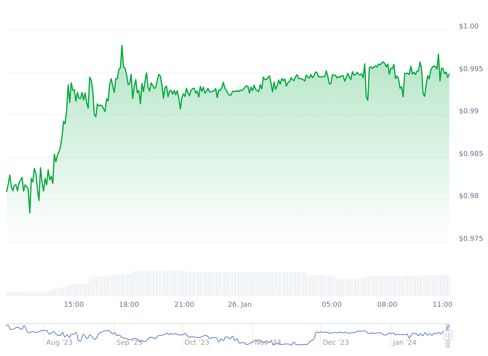 Trueusd (TUSD), hiện là stablecoin lớn thứ năm theo vốn hóa thị trường, đã trải qua những biến động dưới mức chốt 1 đô la Mỹ kể từ ngày 15 tháng 1 năm 2024. Vào ngày 17 tháng 1, giá trị của TUSD đã giảm xuống còn 0,97 USD mỗi đơn vị. Mặc dù nó đã nhanh chóng phục hồi lên mốc 0,99 USD vào ngày hôm sau, nhưng tính đến tối ngày thứ Năm, TUSD đang giao dịch trong khoảng từ 0,97 USD đến 0,98 USD.