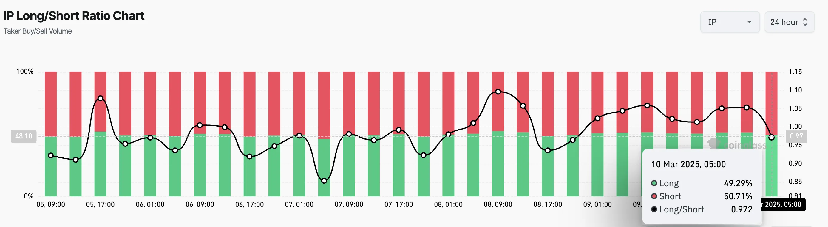 Trong trường hợp của IP, khi tỷ lệ này giảm xuống dưới 1, điều đó có nghĩa là số lượng vị thế Short đang vượt quá số lượng vị thế Long, cho thấy các trader chủ yếu đặt cược vào khả năng giảm giá.