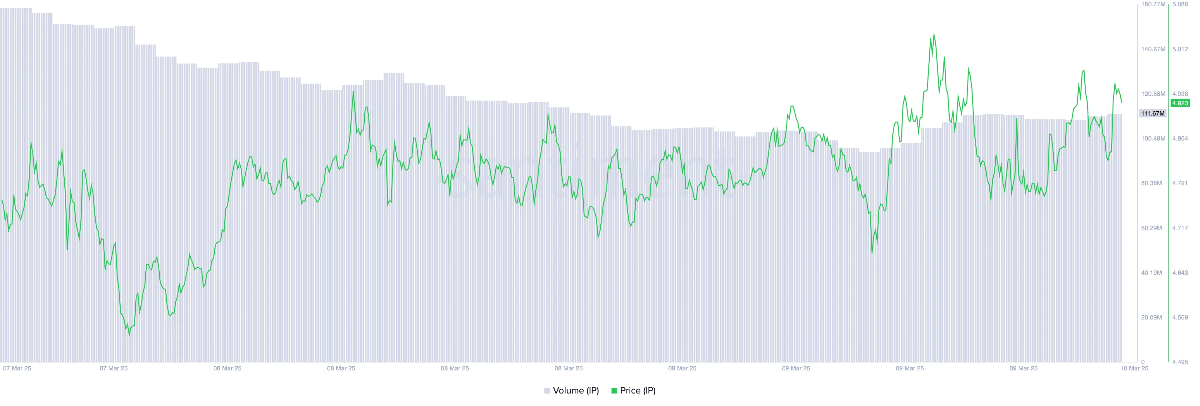Khối lượng giao dịch hàng ngày của IP đã tăng 53% trong 24 giờ qua, đạt mức 159,47 triệu đô la. Mức tăng đột biến này diễn ra bất chấp sự suy thoái chung của thị trường, khi tổng vốn hóa thị trường crypto giảm 148 tỷ đô la trong cùng kỳ.