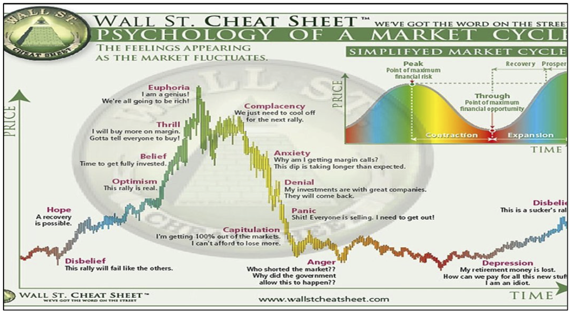 Nhà phân tích tham khảo Wall Street Cheat Sheet, một biểu đồ cổ điển cố gắng mô tả các giai đoạn tâm lý mà các nhà đầu tư trải qua trong chu kỳ thị trường đầy biến động. Theo lý thuyết, sự kết thúc của chu kỳ là “giai đoạn suy thoái”, khi giá ở mức cực thấp.