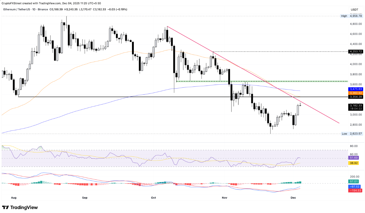 Tại thời điểm viết bài ngày thứ Năm, Ethereum đang được giao dịch quanh mốc 3.200 USD, duy trì trạng thái ổn định sau nhịp phục hồi hơn 14% trong hai ngày trước đó. Trên biểu đồ ngày, giá ETH đang tiến sát đường kháng cự quan trọng được hình thành từ việc nối hai đỉnh ngày 7/10 và 27/10, nằm quanh vùng 3.250 USD.