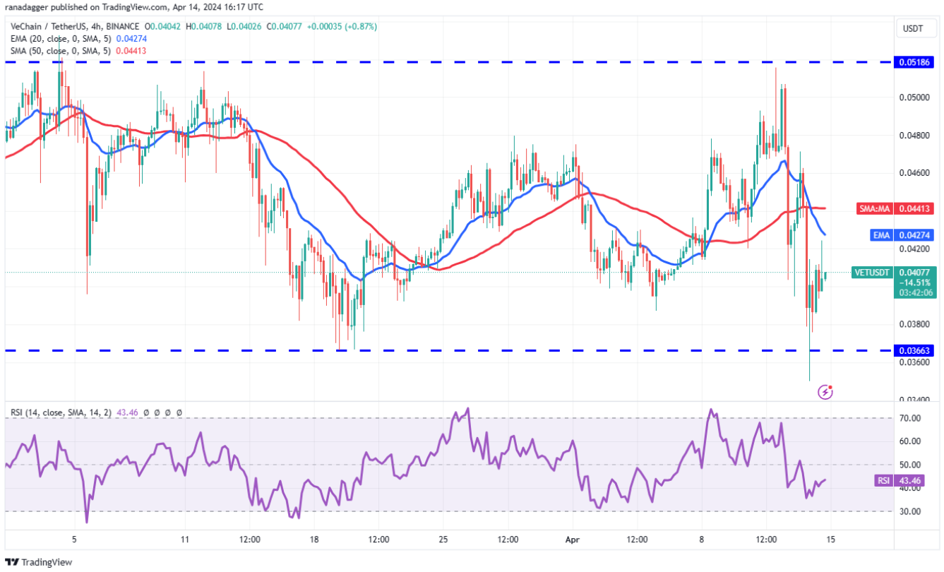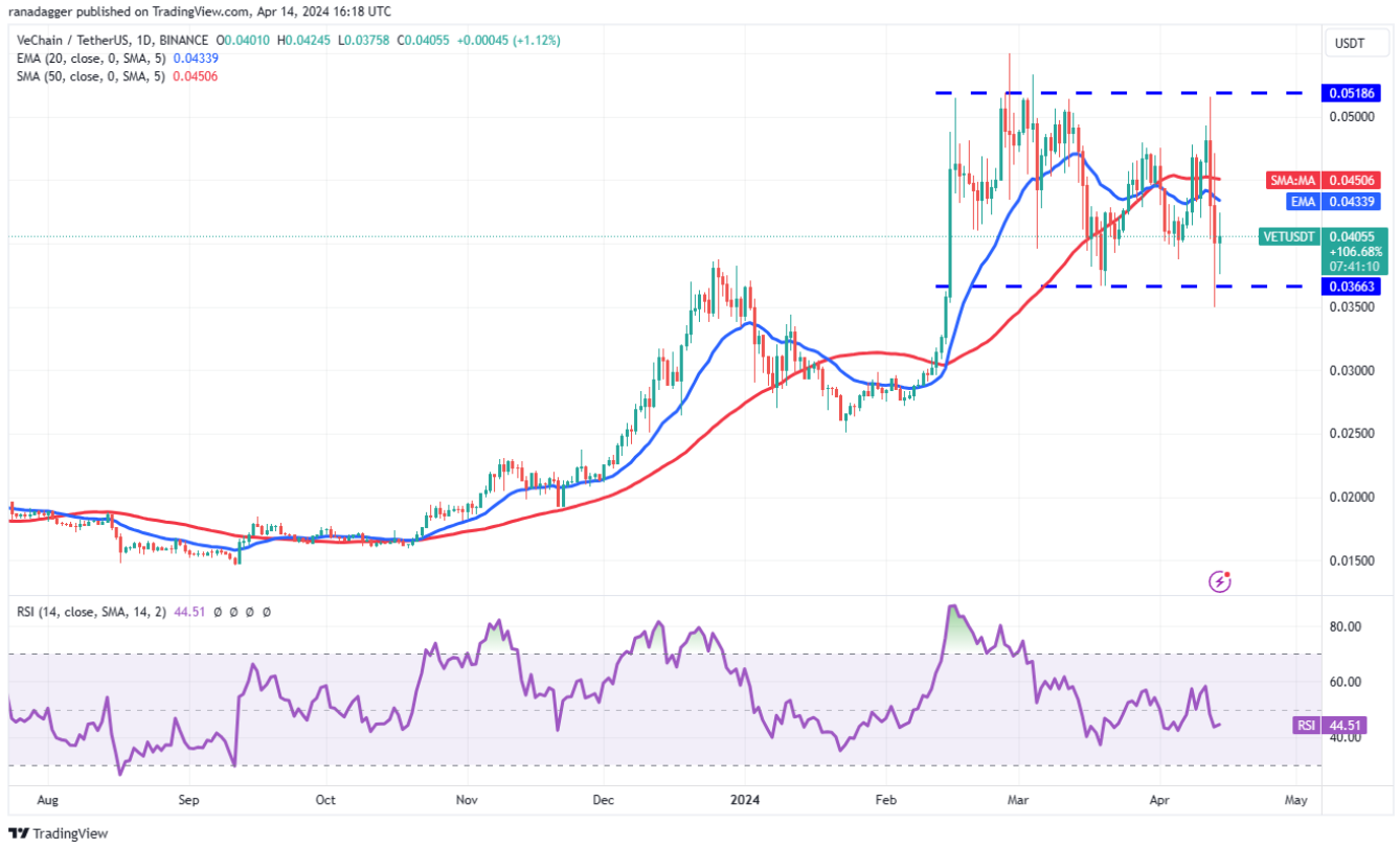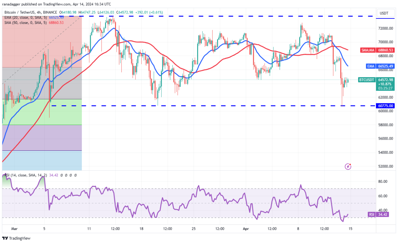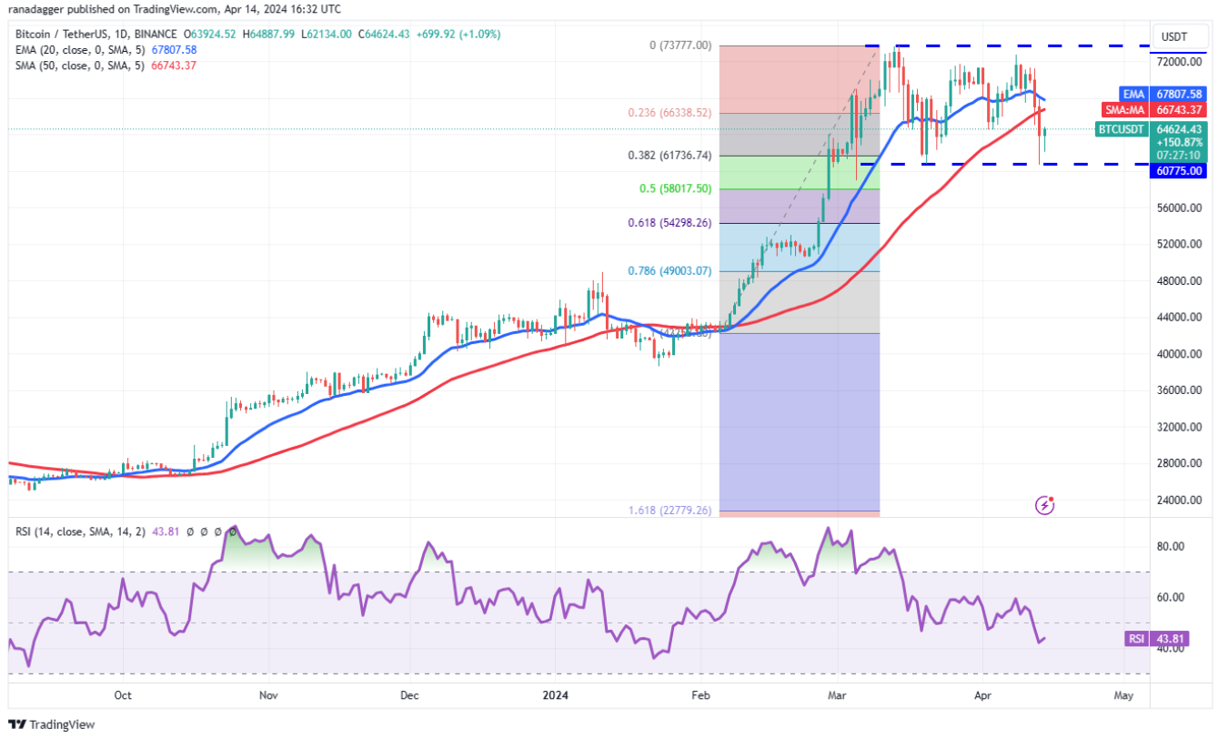 Cặp BTC/USDT đã trượt xuống dưới đường trung bình động đơn giản 50 ngày ($66.743) vào ngày 13 tháng 4 và giảm xuống dưới mức hỗ trợ $60.775. Tuy nhiên, phần đuôi dài trên thanh nến cho thấy phe bò đang bảo vệ $60.775.