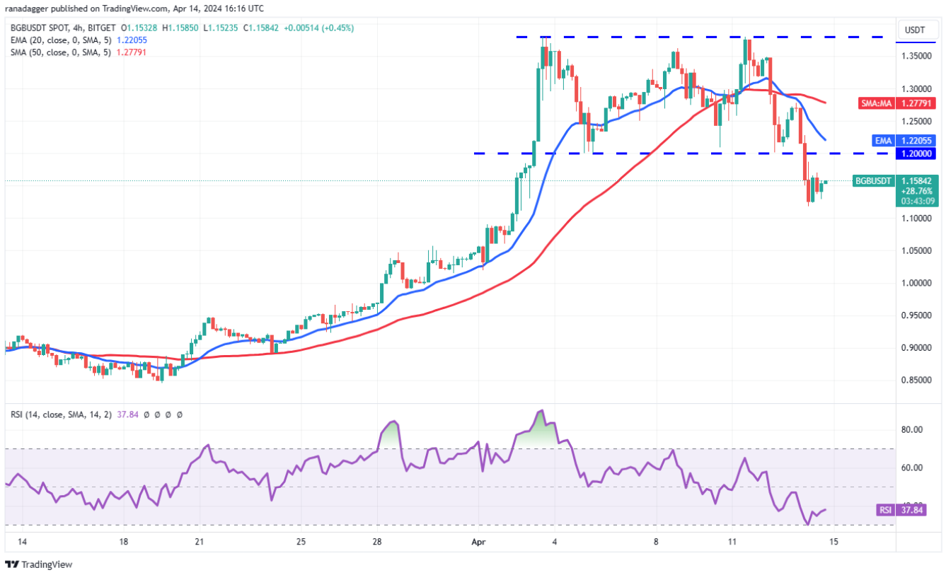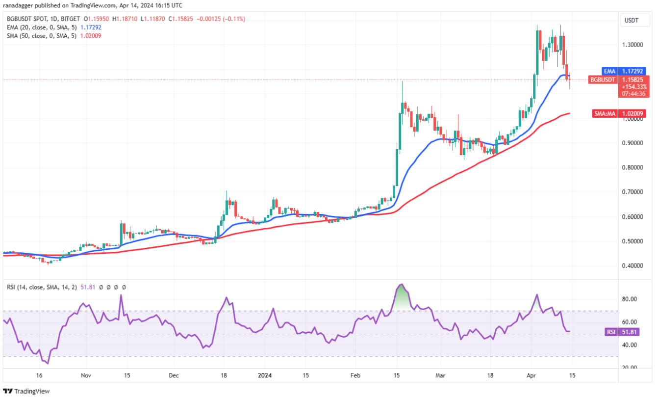 Phe gấu đã kéo giá xuống dưới đường EMA 20 ngày ($1,17) vào ngày 13 tháng 4, nhưng họ đang vật lộn để đẩy cặp BGB/USDT xuống SMA 50 ngày ($1,02). Điều này cho thấy phe bò tiếp tục mua ở mức giá thấp hơn.