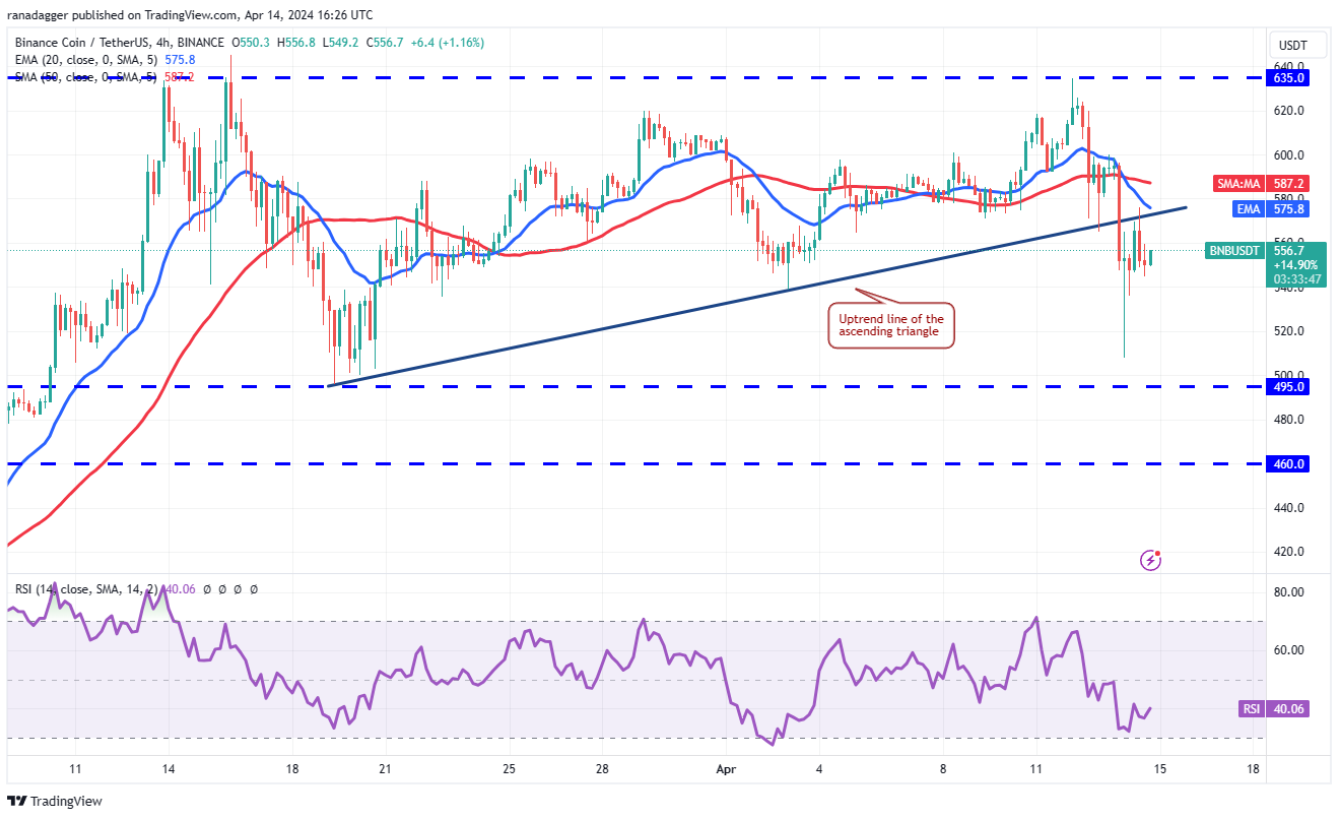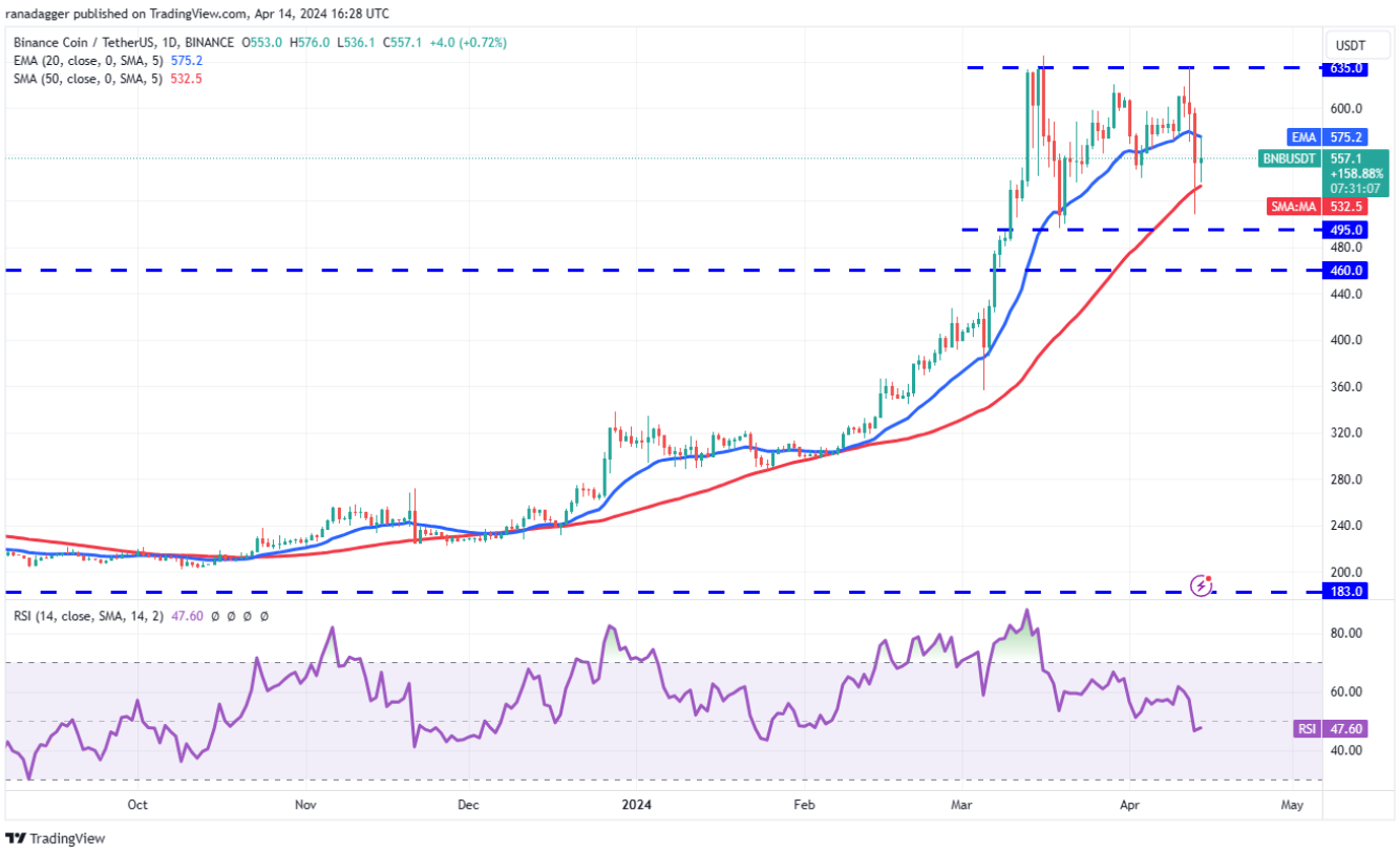 Giá đã giảm xuống gần mức hỗ trợ của phạm vi ở $495 vào ngày 13 tháng 4, nhưng phần đuôi dài trên thanh nến cho thấy lực mua mạnh ở các mức giá thấp hơn. Phe bò sẽ cố gắng duy trì đà tăng và đẩy cặp BNB/USDT lên mức kháng cự $635. Người bán có khả năng bảo vệ mức này một cách mạnh mẽ.