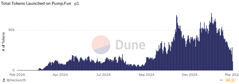 Lượng token ra mắt hàng ngày trên PumpFun đạt đỉnh vào khoảng cuối tháng 12/2024, vượt qua 50.000 token ở mức đỉnh điểm. Tuy nhiên, hoạt động đã giảm mạnh kể từ đó, với số token mới được ra mắt hiện tương đương với tháng 9/2024 – trước khi làn sóng đầu cơ gần đây nhất diễn ra.