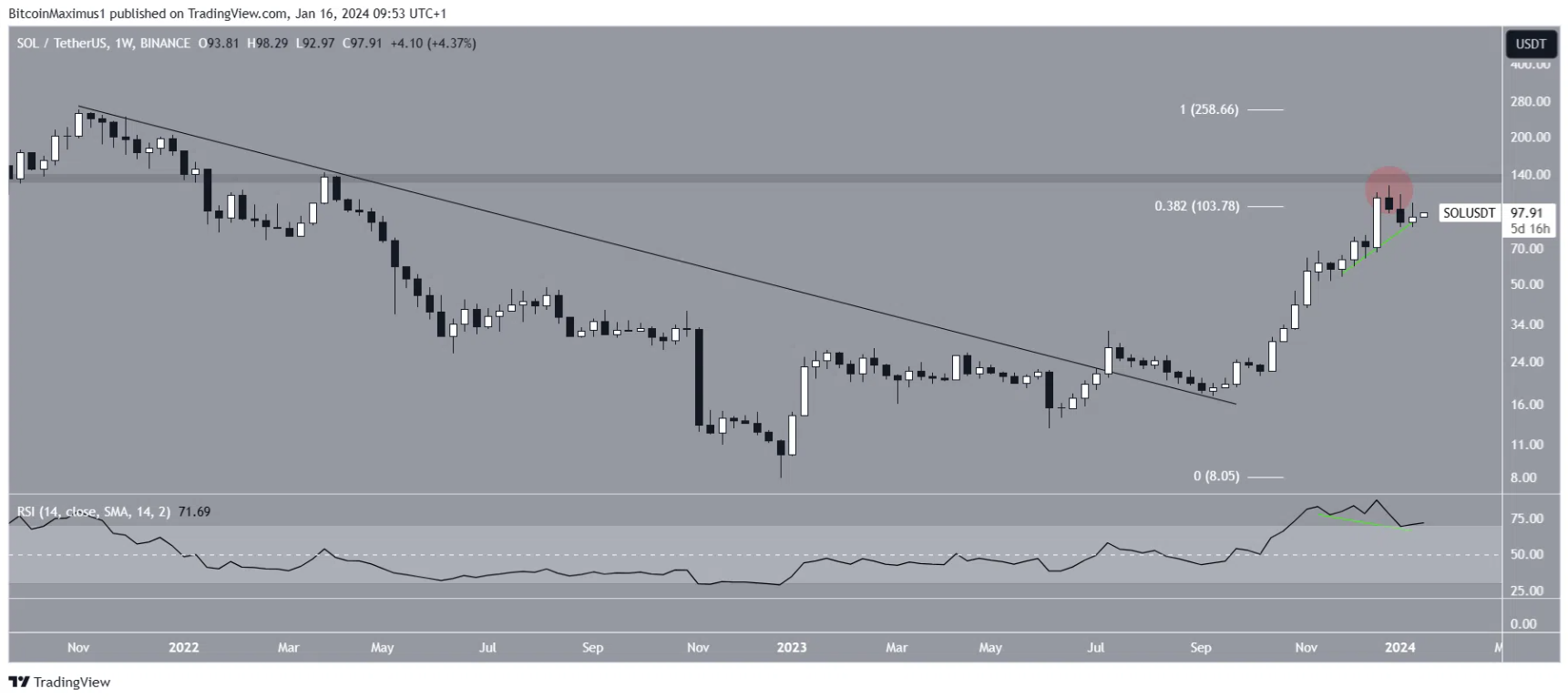 SOL đã có xu hướng tăng kể từ khi nó bứt phá lên trên đường kháng cự giảm dần vào tháng 7 năm 2023.