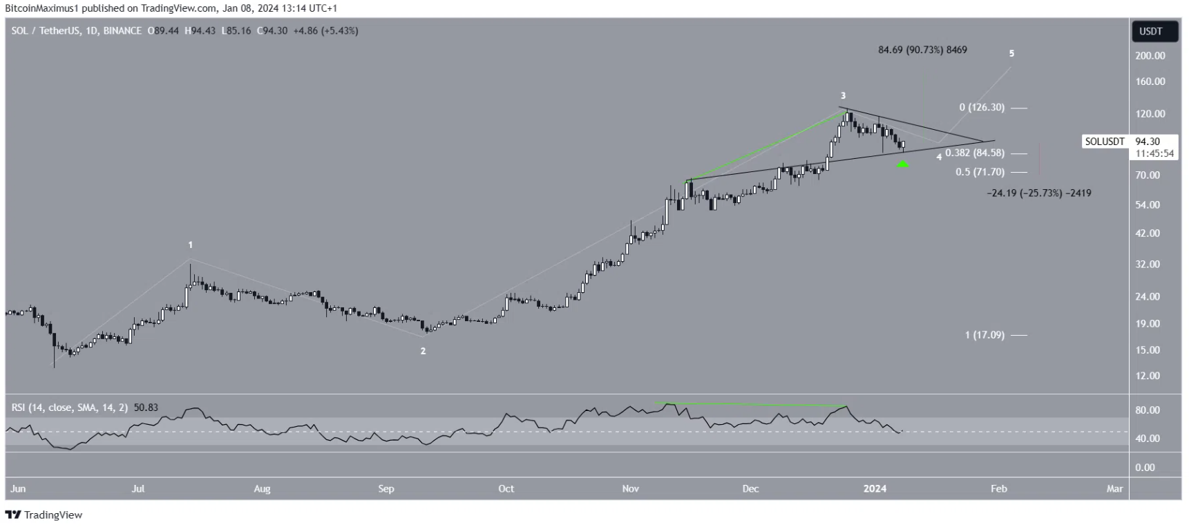 Các nhà phân tích kỹ thuật sử dụng lý thuyết Sóng Elliott để xác định hướng của một xu hướng, bao gồm việc nghiên cứu các mô hình giá dài hạn và tâm lý nhà đầu tư. Số lượng sóng có khả năng nhất cho thấy rằng SOL nằm trong sóng bốn của chuyển động đi lên gồm năm sóng bắt đầu vào tháng 6 năm 2023 (màu trắng).