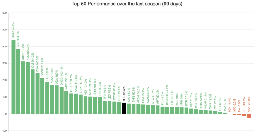 Chỉ số Altcoin Season, xác nhận mùa altcoin nếu 75% trong số 50 dự án hàng đầu (không phải BTC) hoạt động tốt hơn Bitcoin, đã nêu bật XRP là một trong những loại coin đóng góp hàng đầu cùng với Hedera (HBAR) và Bitget Token (BGB) trong giai đoạn này. Do đó, chỉ số này gần đây đã đạt đỉnh ở mức 78, cho thấy tín hiệu về mùa altcoin.