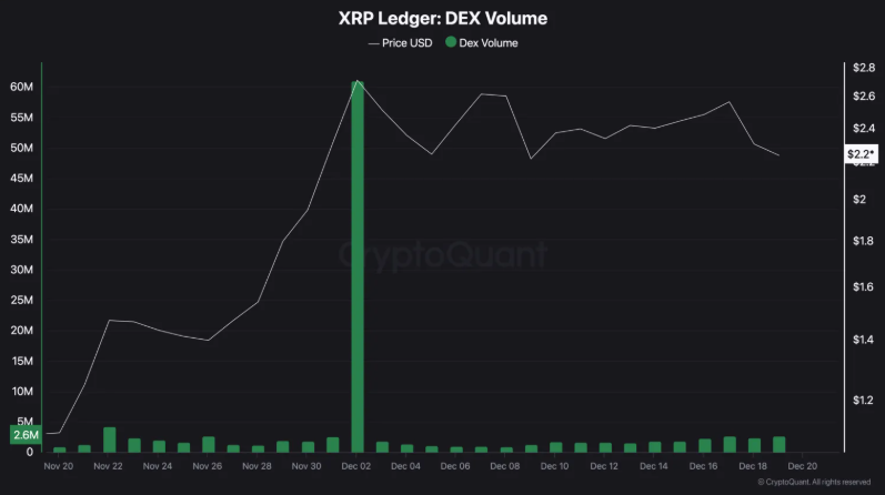 Như đã đề cập ở trên, khối lượng giao dịch XRP DEX đã tăng lên 61,01 triệu USD vào ngày 2 tháng 12. Hôm nay, khối lượng đã giảm đến 58 triệu USD xuống chỉ còn 2,66 triệu USD. Nếu duy trì, giá XRP có thể phải đối mặt với áp lực giảm liên tục.