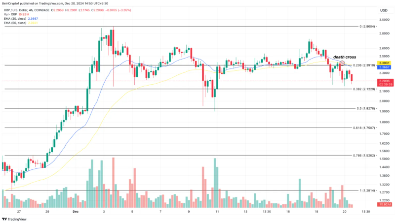 Trên biểu đồ XRP/USD 4 giờ, altcoin này đã phải đối mặt với death cross, xảy ra khi Đường trung bình động hàm mũ (EMA) dài hạn trượt xuống dưới đường ngắn hạn và là dấu hiệu giảm giá.
