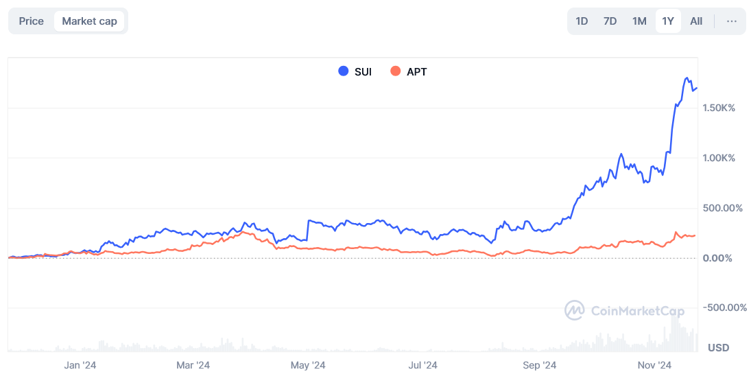 Về diễn biến giá, token SUI đã thể hiện sự vượt trội so với APT trong năm nay, với mức tăng trưởng ấn tượng và vượt qua Aptos về vốn hóa thị trường vào giữa tháng 9.