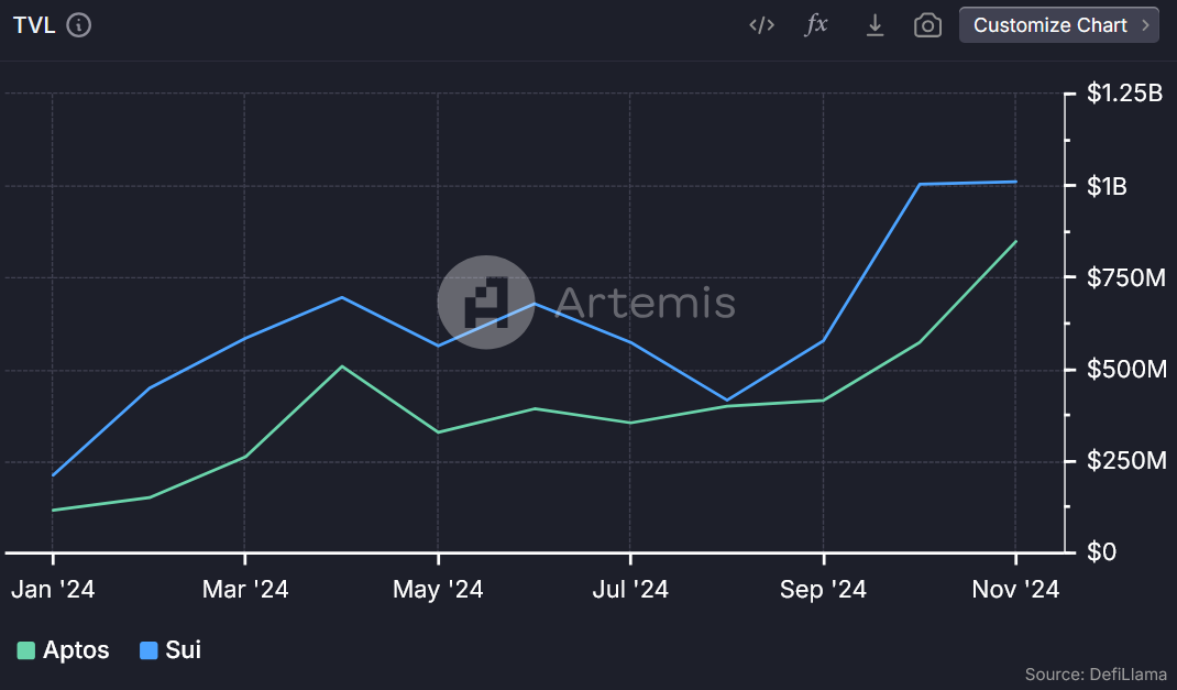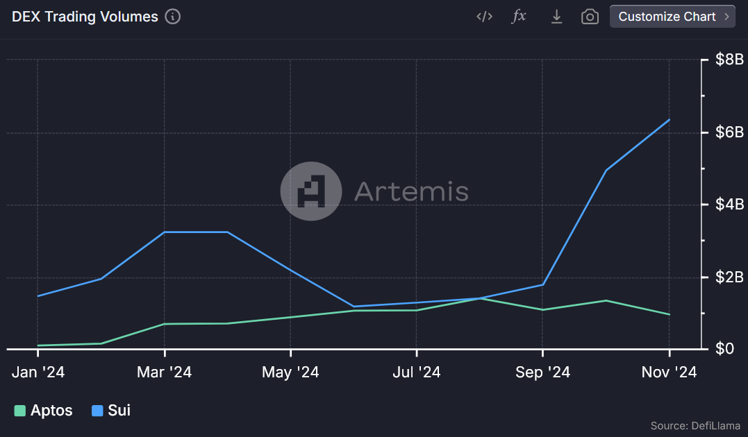 Khi xem xét hoạt động on-chain, Sui đã ghi nhận sự bùng nổ trong giao dịch DEX, với khối lượng giao dịch gấp ba lần kể từ tháng 9, vượt qua Aptos trong tháng vừa qua.