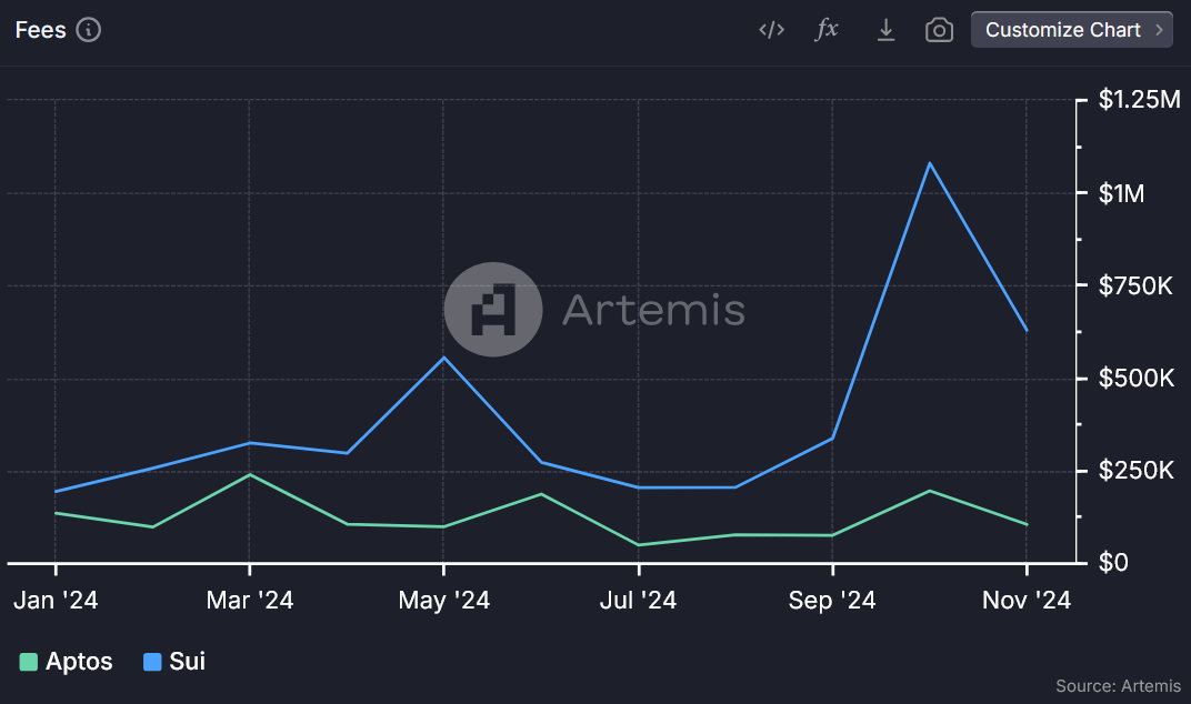 Ngoài ra, về phí giao dịch, Sui cũng vượt trội hơn, với 1,1 triệu USD được tạo ra chỉ trong tháng 10, trong khi Aptos chỉ đạt 196 nghìn USD trong cùng kỳ.